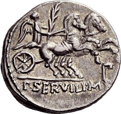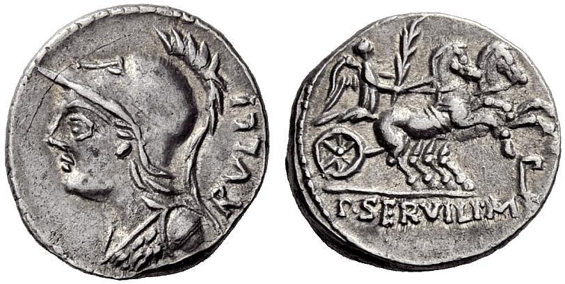 The Roman Republic. P. Servilius M.f. Rullus. Denarius 100, AR 3.84g. Helmeted bust of Minerva l. Rev. Victory, holding palm branch, in prancing biga r. Babelon Servilia 14. Sydenham 601. Crawford 328/1. Extremely fine. Ex NAC sale 29, 2005, 362.