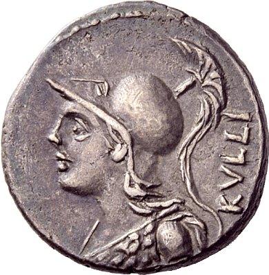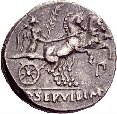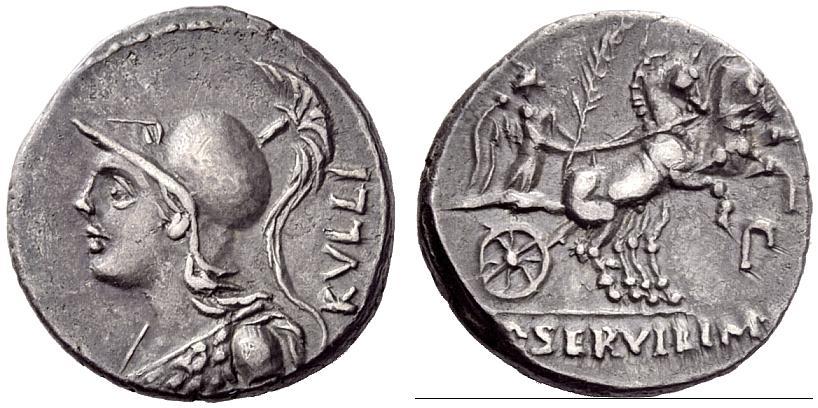 The Roman Republic. P. Servilius M.f. Rullus. Denarius 100, AR 3.97g. Helmeted bust of Minerva l.; behind, RVLLI. Rev. Victory, holding palm branch, in prancing biga r.; below, P. In exergue, P·SERVILI·M·F. Babelon Servilia 14. Sydenham 601. Crawford 328/1. Lightly toned and about extremely fine