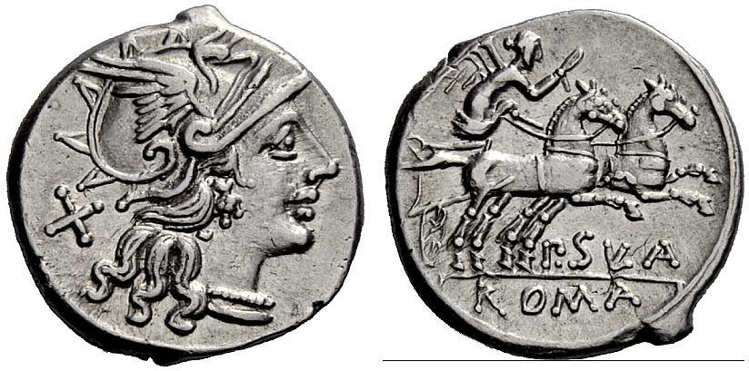 The Roman Republic. P. Sula. Denarius 151, AR 3.84g. Helmeted head of Roma r.; behind, X. Rev. Diana in biga r.; below, P.SVLA. In exergue, ROMA. Babelon Cornelia 1. Sydenham 386. Crawford 205/1. Extremely fine