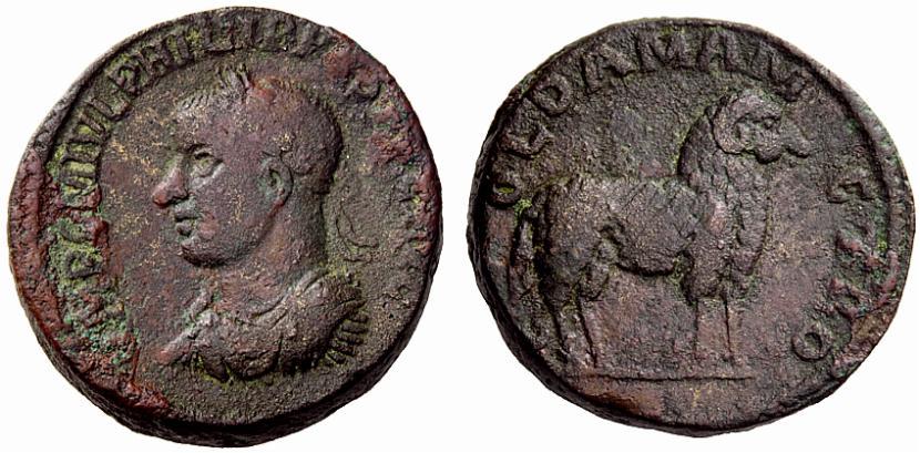The Roman Republic. Philip II augustus, 246–249. Bronze, Damascus Syriae 246-249, Æ 14.43 Laureate, draped and cuirassed bust l. Rev. Ram r. Mionnet suppl. VIII, 39 f. Very rare. About very fine. Ex Gorny & Mosch sale 114, 2002, 184.