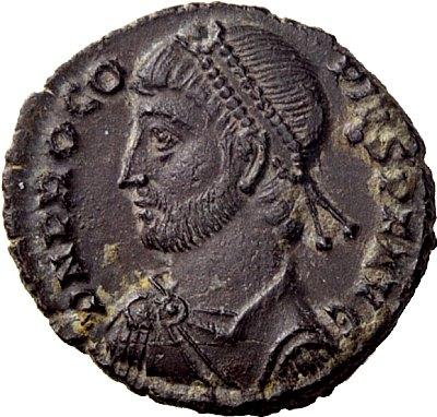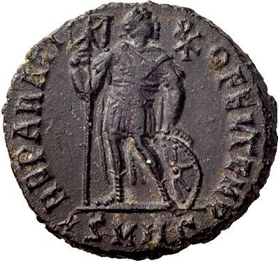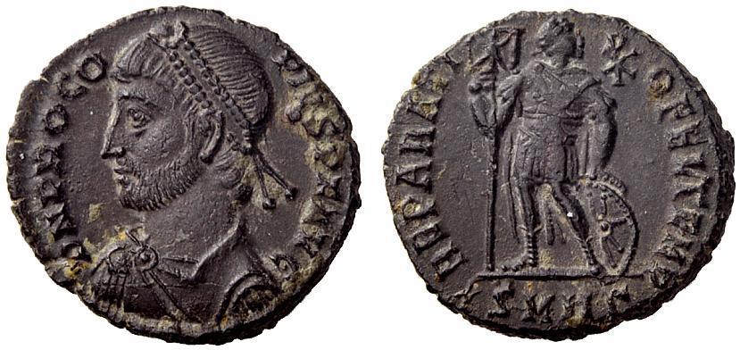 The Roman Republic. Procopius, 365–366. Æ 3, Heraclea 365-366, Æ 3.53g. Pearl-diademed, draped and cuirassed bust l. Rev. Emperor standing facing, head r., holding labarum in r. hand and resting l. on shield; above in r. field, christogram. C 8. RIC 7. Good very fine