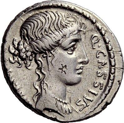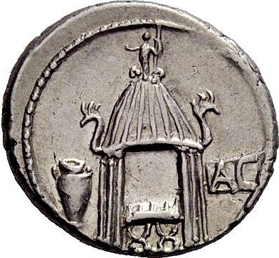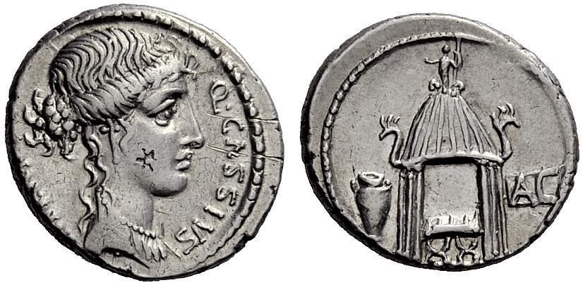 The Roman Republic. Q. Cassius Longinus. Denarius 55, AR 3.72g. Head of Libertas r. Rev. Curule chair within temple of Vesta; in l. field, urn; in r. field, tablet. Babelon Cassia 8. Sydenham 916. Crawford 428/2. Two light scratches and a countermark on cheek, otherwise good very fine / about extremely fine