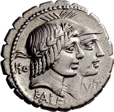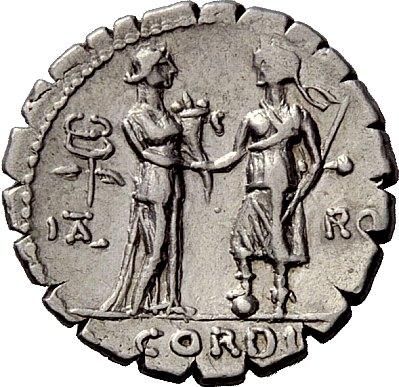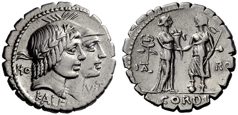 The Roman Republic. Q. Fufius Calenus and Mucius Cordus. Denarius serratus 70, AR 3.98g. Jugate heads of Honos and Virtus r. Rev. Italia, holding cornucopia, and Roma, holding fasces and placing r. foot on globe, clasping their hands; at side, winged caduceus. Babelon Fufia 1 and Mucia 1. Sydenham 797. Crawford 403/1. Good very fine