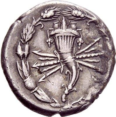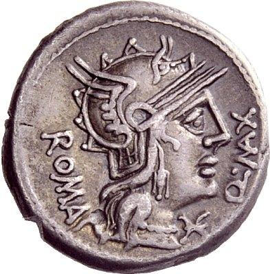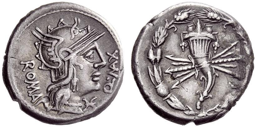 The Roman Republic. Q. Max. Denarius 127, AR 3.89g. Helmeted head of Roma r.; below chin, Ú. Rev. Cornucopiae on thunderbolt within wreath of ear of barley and wheat with assorted fruits. Babelon Fabia 5. Sydenham 478. Crawford 265/1. Scarce. Old cabinet tone and about extremely fine