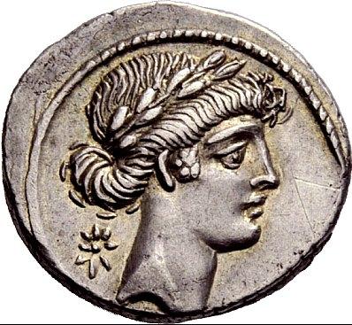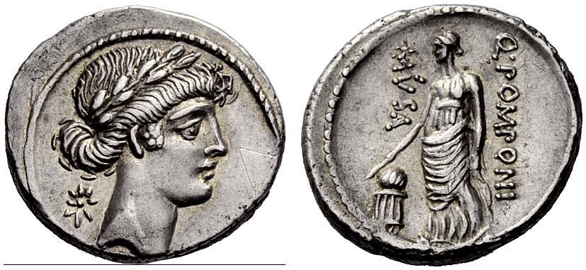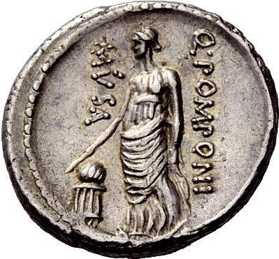 The Roman Republic. Q. Pomponius Musa. Denarius 66, AR 3.82g. Laureate head of Apollo r.; behind, star. Rev. Q·POMPONI–MVSA Urania standing l., holding rod which she points to globe resting on tripod. Babelon Pomponia 22. Sydenham 823. Crawford 410/8. Lightly toned, graffito on obverse, otherwise good extremely fine
