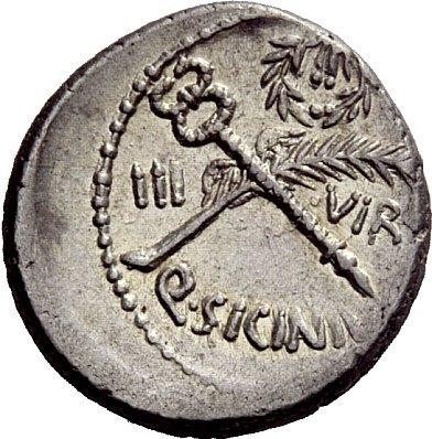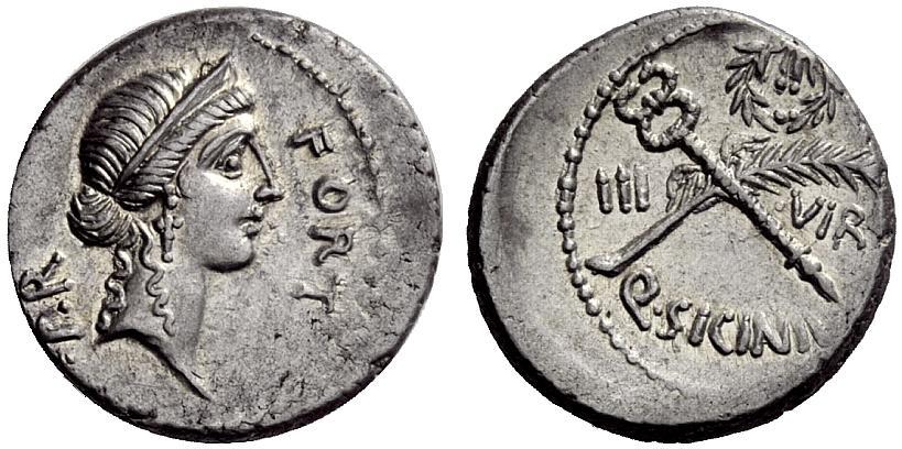 The Roman Republic. Q. Sicinius. Denarius 49. AR 3.80g. Diademed head of Fortuna Populi Romani r. Rev. Palm branch tied with fillet and winged caduceus in saltire; above, wreath. Babelon Sicinia 5. Sydenham 938. Sear Imperators 1. Crawford 440/1. Extremely fine