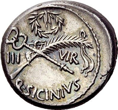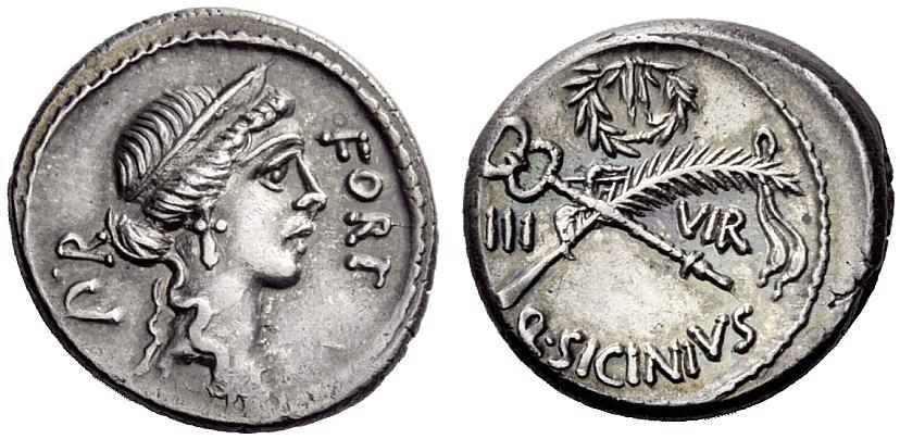 The Roman Republic. Q. Sicinius. Denarius 49. AR 3.89g. FORT–P·R Diademed head of Fortuna Populi Romani r. Rev. Palm branch tied with fillet and winged caduceus in saltire; above, wreath. On either side, III–VIR and below, Q·SICINIVS. Babelon Sicinia 5. Sydenham 938. Sear Imperators 1. Crawford 440/1. Iridescent tone and extremely fine