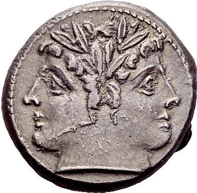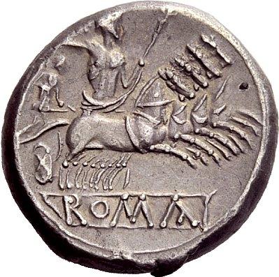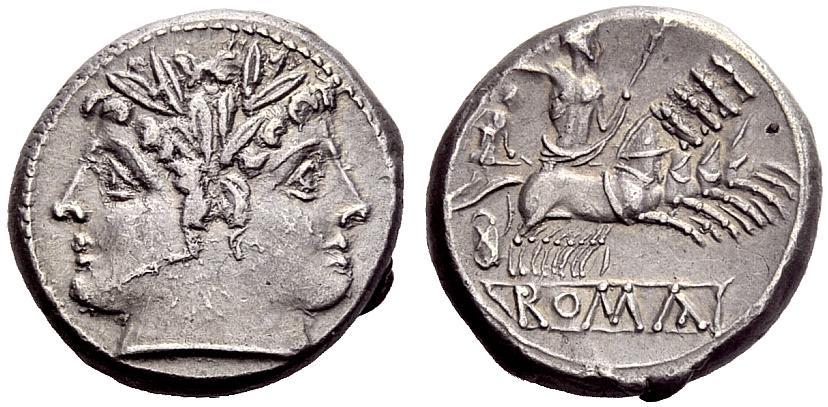 The Roman Republic, Quadrigatus, uncertain mint ca. 225-214, AR 6.58 g. Laureate Janiform head of Dioscuri. Rev. Jupiter, holding sceptre and hurling thunderbolt, in fast quadriga r. driven by Victory; below, ROMA in linear frame. Sydenham 65. Crawford 28/3 and cf. pl. 4, 1-4. Toned and about extremely fine
