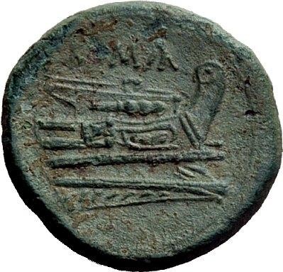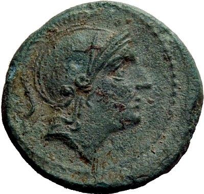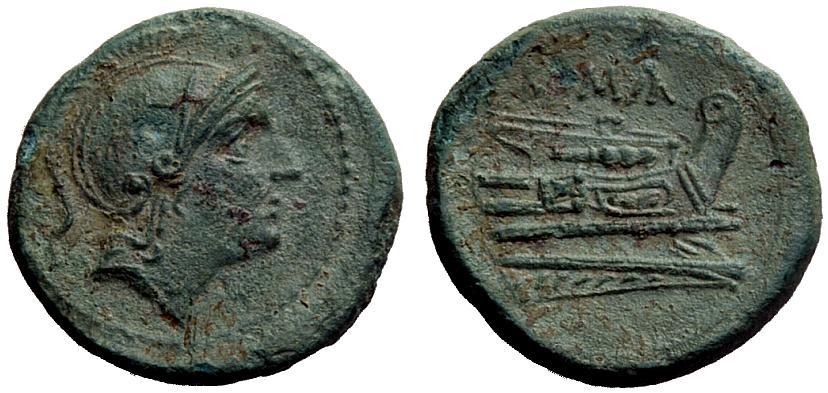 The Roman Republic. Quartuncia 217-215, Æ 2,63g. Helmeted head of Roma r. Rev. Prow r. Sydenham 88. Crawford 38/8. Lovely turquoise patina with an almost invisible break on helmet, about extremely fine