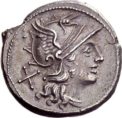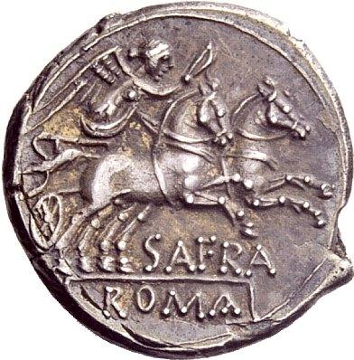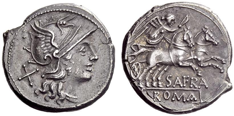 The Roman Republic. S. Afranius. Denarius 150, AR 3.53g. Helmeted head of Roma r.; behind, X. Rev. Victory in prancing biga r.; below, SAFRA and ROMA in linear frame. Babelon Afrania 1. Sydenham 388. Crawford 206/1. Beautifully toned, minor flan crack at two o’clock on obverse, otherwise extremely fine / good extremely fine