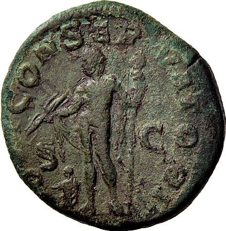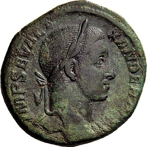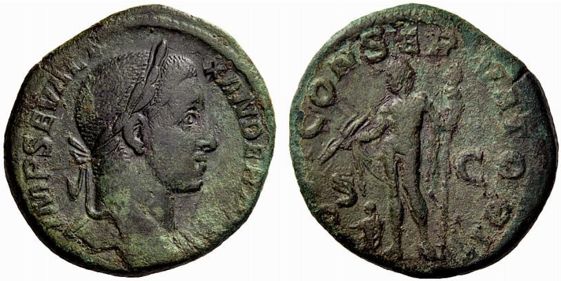 The Roman Republic. Severus Alexander, 222–235. Sestertius 231, Æ 17.26g. Laureate bust r., with drapery on l. shoulder. Rev. Jupiter, naked but for cloak over shoulder, standing l. and holding thunderbolt and sceptre; at foot l., small figure of emperor. C 74 var. (bare bust). BMC 692. RIC 559. Light green patina and very fine / about very fine. Ex Gorny & Mosch sale 115, 2002, 1738.