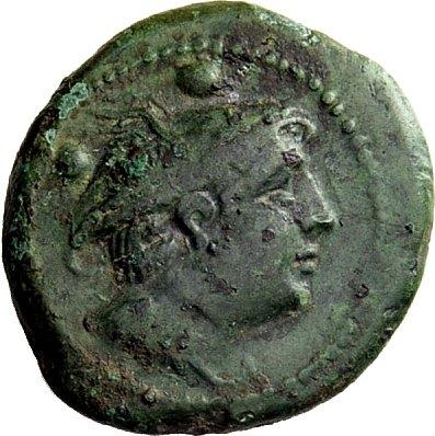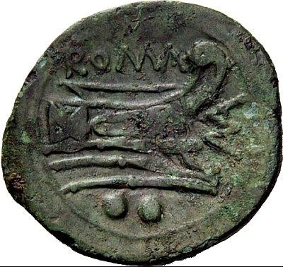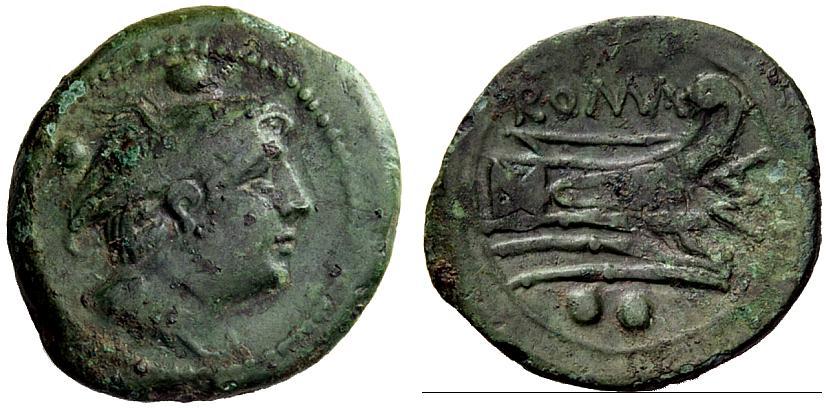 The Roman Republic. Sextans after 211, Æ 3.82g. Head of Mercury r. Rev. Prow r.; below, two pellets. Sydenham 143d. Crawford 56/6. Enamel-like green patina and good very fine