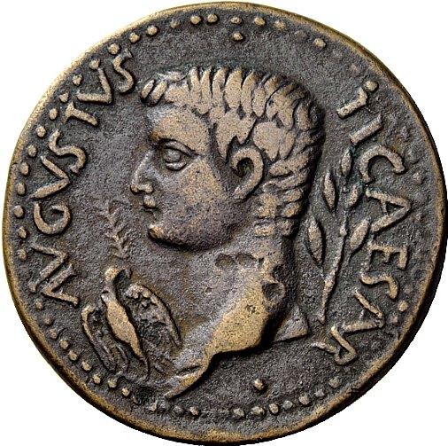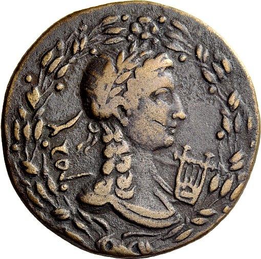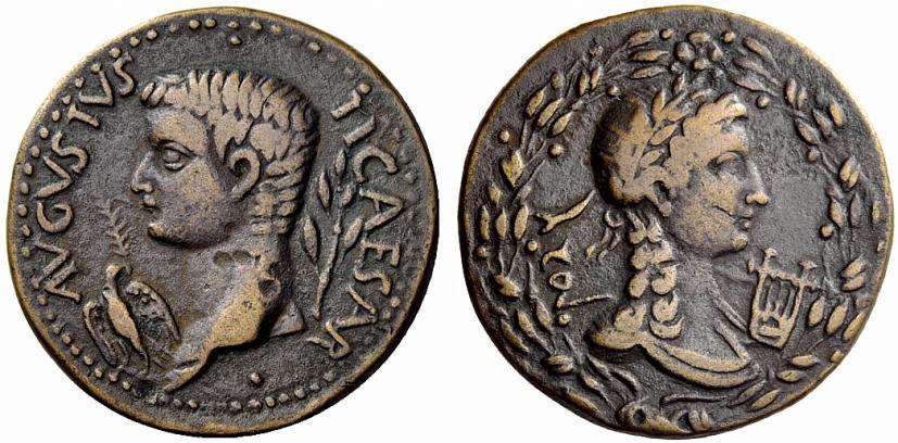 The Roman Republic. Tiberius, 14–37. Bronze, Oea Africa Proconsularis after 22-23, Æ 13.58g. Bare head of Tiberius l.; on l., eagle, and on r., branch. Rev. Laureate bust of Apollo r.; on r. lyre. RPC 832 Very rare. Light brown patina and very fine
