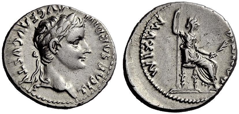 The Roman Republic. Tiberius, 14–37. Denarius, Lugdunum 14-37, AR 3.81g. Laureate head r. Rev. Pax-Livia figure seated r. on chair with ornamented legs, holding long vertical sceptre and branch. C 16. BMC 48. RIC 30. CBN 34. About extremely fine