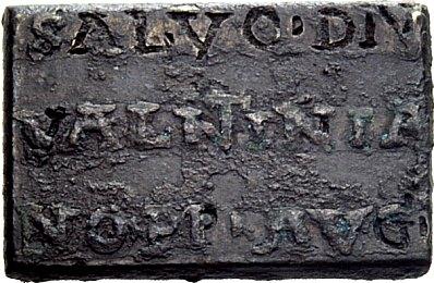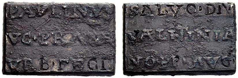 The Roman Republic. Time of Valentinian III. Exagium, Æ 4.27g. SALVO DN / VALENTINIA / NO P P AVG Rev. PAVLINVS / VC· PRAEF / VRB FECI Apparently unrecorded. Very fine
