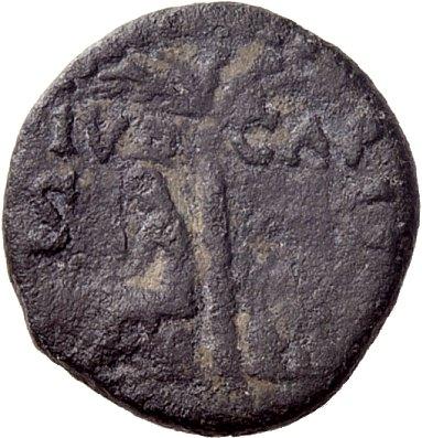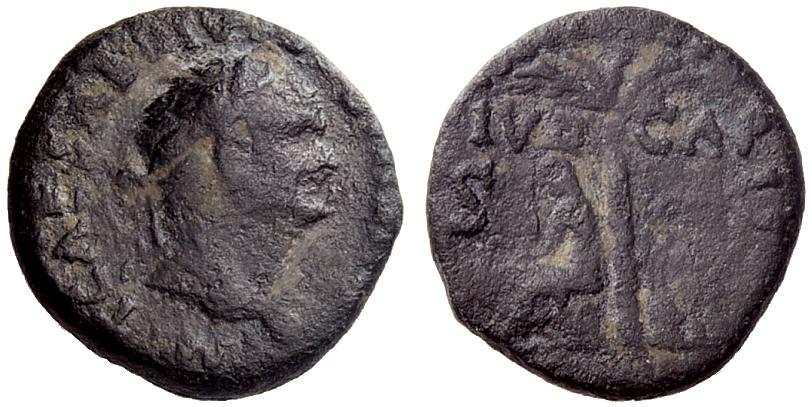 The Roman Republic. Titus augustus, 79–81. Semis, Eastern mint (Thrace ?), Æ 3.65g. Laureate head r. Rev. Judaea seated l. in attitude of mourning; behind palm tree and to r., yoke. BMC 259. RIC 504. Hendin 795. Very rare. Fine