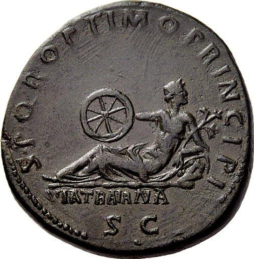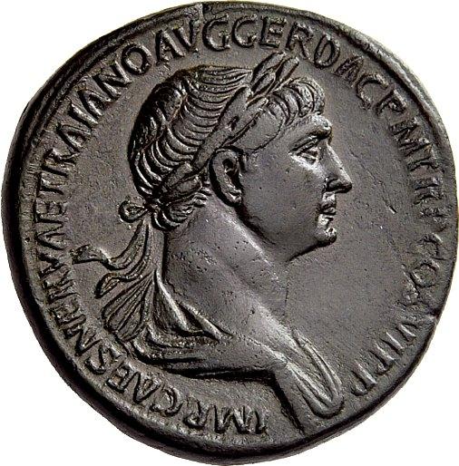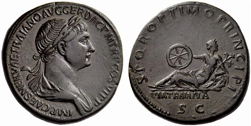 The Roman Republic. Trajan, 98–117. Sestertius 112-114, Æ 26.28 g Laureate and draped bust r. Rev. Woman reclining l., holding wheel and branch, looking back. C 650 var. (omits CAES). BMC 988. RIC 637. Dark green patina gently tooled, otherwise good very fine