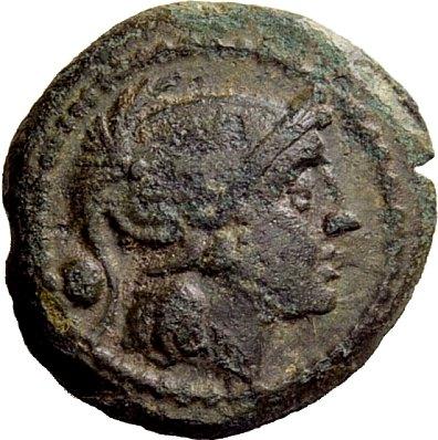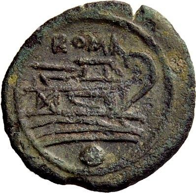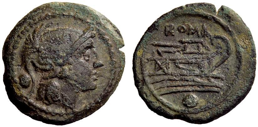 The Roman Republic. Uncia after 211, Æ 3,73g. Helmeted head of Roma r.; behind, pellet. Rev. Prow r.; below, pellet. Sydenham 143e. Crawford 56/7. Light green patina and good very fine