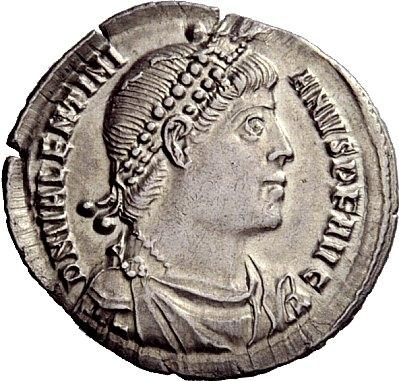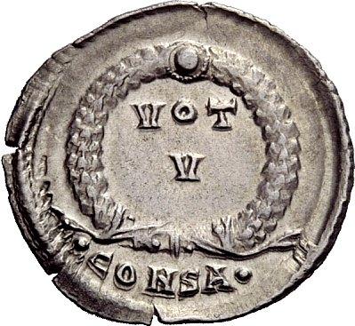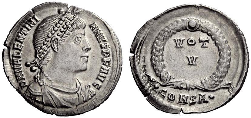The Roman Republic. Valentinian I, 364–375. Siliqua, Constantinople 364-367, AR 1.77g. Pearl-diademed, draped and cuirassed bust r. Rev. Legend within wreath; in exergue CONSA. C 69 RIC 13a. About extremely fine