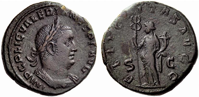The Roman Republic. Valerian I, 253–260. Sestertius 255-256, Æ 19.01g. Laureate and cuirassed bust r. with drapery on l. shoulder. Rev. Felicitas standing l., holding caduceus and cornucopiae. C 58. RIC 157. Dark tone, very fine
