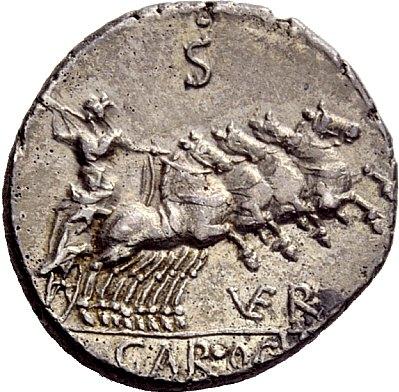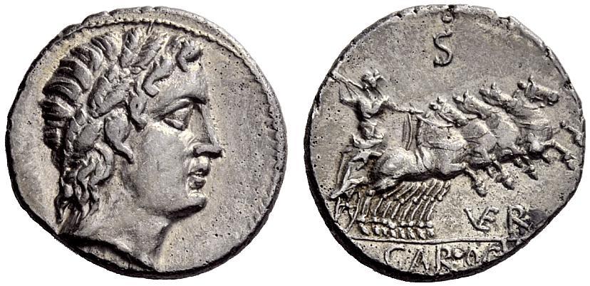 The Roman Republic. Vergilius, Gargilius, Ogulnius. Denarius 86, AR 3.93g. Head of Apollo r., wearing oak-wreath; below neck truncation, [thunderbolt]. Rev. Jupiter in quadriga r., holding reins and hurling thunderbolt; above, S and below horses, VER. In exergue, GAR·OG[VL]. Babelon Vergilia 1. Sydenham 721d. Crawford 350A/1e. Rare. Extremely fine