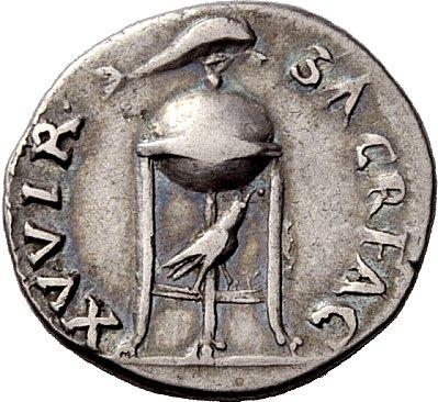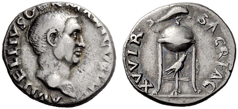 The Roman Republic. Vitellius, April–December 69. Denarius late April-December 69, AR 3.40g. Bare head r. Rev. Tripod with dolphin set on top and raven standing r. below. C 115. BMC 3. RIC 70. Lightly toned and very fine