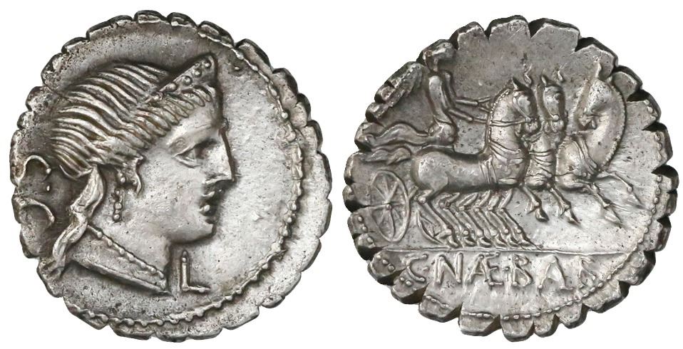 Roman Republic, AR denarius, C. Naevius Balbus, 79 BC, Rome mint. Crawford 382/1 a; Sydenham 769. 3.68 grams. Diademed head of Venus right / Victory driving galloping triga right, holding reins. Off-center XF with muted toning, serrated edge.