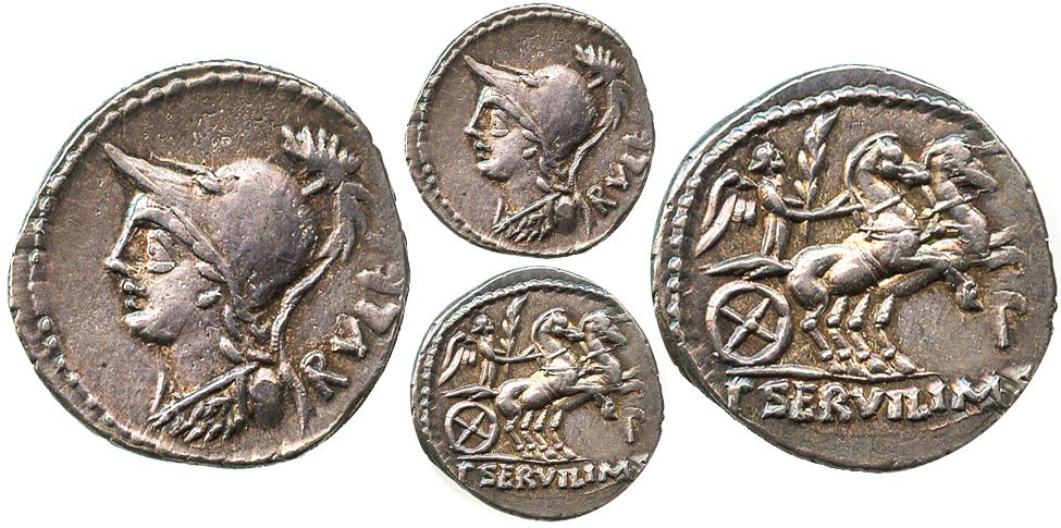 Roman Republic, AR denarius, P. Servilius M.f. Rullus, 100 BC, Rome mint. Servilia 14; BMC 1672; Syd. 601; Craw .328/1. 4.0 grams. Bust of Roma left, wearing Corinthian helmet and aegis; RVLLI behind / Victory in biga right, P below horses; in exergue, P. SERVILI M.F. Perfectly centered UNC with faint iridescent toning. "P (publice) shows that these coins were struck from silver withdrawn from the public treasury, and that the issue therefore was an special one." [Seaby, p. 88]