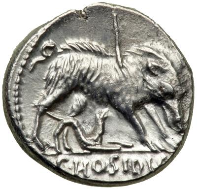 Roman Republic. C. Hosidius C.f., moneyer, c. 64 BC. AR Denarius struck at Rome. Diademed bust right of Diana, bow and quiver over shoulder. Reverse: Calydonian boar struck by spear, attacked by hound. Cr. 407/2; Syd. 903; Hosidia 1. Boldly struck and lustrous; Nearly Mint State.