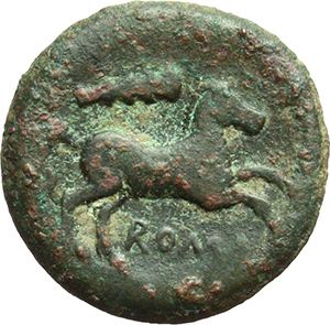 Roman Republican. AE, ca 230-226. Obv.: Helmeted head of beardless Mars right; behind, club. Rev.: Horse galloping right; above, club and below, ROMA. Syd. 24. Cr. 27/2. HN Italy 315. AE. g. 3.06 mm. 15.50 VF. Repubblica Romana. AE, ca 230-226. D/ Testa elmata di Marte a destra; dietro, una clava. R/ Cavallo al galoppo a destra; sopra, una clava. Sotto, ROMA. Syd. 24. Cr. 27/2. HN Italy 315. AE. g. 3.06 mm. 15.50 BB.