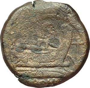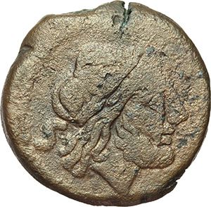 Roman Republican. 'Anchor' series. Semis, ca 169-158. Obv.: Laureate head of Saturn right, behid S. Rev.: Prow right; above S, before anchor. Below, ROMA. Syd 238a. Cr. 194/2. AE. g. 20.43 mm. 27.00 VF. Repubblica Romana. Serie 'ancora'. Semisse, ca 169-158. D/ Testa di Saturno laureata a destra, dietro S. R/ Prua a destra; sopra S, davanti ancora. Sotto, ROMA. Syd 238a. Cr. 194/2. AE. g. 20.43 mm. 27.00 BB.