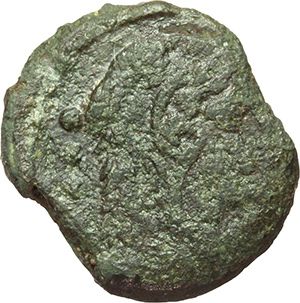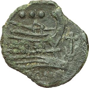 Roman Republican. 'Anchor (third)' series. Quadrans, ca 169-158. Obv.: Head of Hercules right, wearing lion skin, behind three pellets. Rev.: Prow right; above, three pellets, before anchor. Below, ROMA. Syd. 238c. Cr. 194/4. AE. g. 4.99 mm. 19.20 RR. F+/VF+. Repubblica Romana. Serie 'ancora' III. Quadrante, ca 169-158. D/ Testa di Ercole a destra con pelle di leone, dietro tre globetti. R/ Prua a destra; sopra tre globetti, davanti ancora. Sotto, ROMA. Syd. 238c. Cr. 194/4. AE. g. 4.99 mm. 19.20 RR. MB+/BB+.