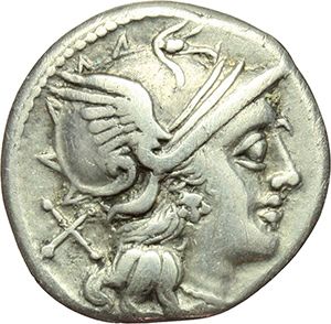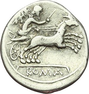 Roman Republican. Anonymous. Denarius, ca 157-156. Obv.: Helmeted head of Roma right; behind X. Rev.: Victory in prancing biga right. In exergue, ROMA. Syd. 376. Cr. 197/1b. AG. g. 3.43 mm. 16.50 VF. Repubblica Romana. Serie anonima. Denario, ca 157-156. D/ Testa elmata di Roma a destra; dietro X. R/ Vittoria su biga al galoppo a destra. In esergo, ROMA. Syd. 376. Cr. 197/1b. AG. g. 3.43 mm. 16.50 BB.