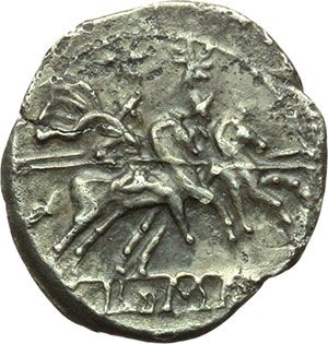 Roman Republican. Anonymous. Sestertius, after 211 BC. Obv.: Head of Roma right. IIS behind. Rev.: The Dioscuri on horseback riding right. ROMA below. Cr.44/7. AG. g. 1.09 R. EF/About EF. Beautiful old cabinet tone. Repubblica Romana. Serie anonima. Sesterzio, dal 211 a.C. D/ Testa di Roma a destra. Dietro, IIS. R/ I Dioscuri al galoppo a destra. Sotto, ROMA. Cr.44/7. AG. g. 1.09 R. Minima rima d'infrazione radiale in ore 5 del D/, altrimenti SPL/qSPL. Molto raro di questa qualità. Bellissima patina di monetiere.