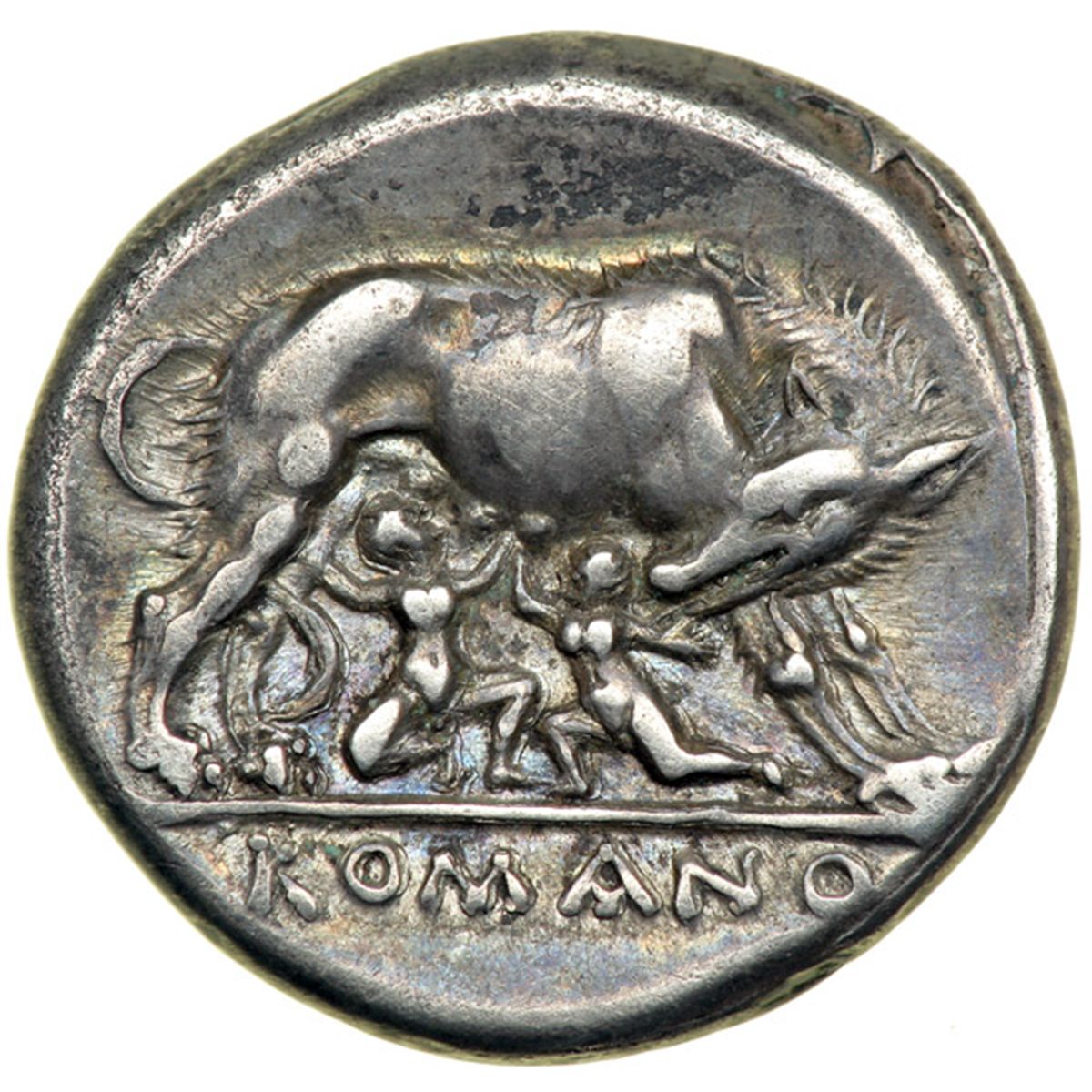 Roman Republican Anonymous Struck Coinage. AR Didrachm (7.17 g) minted at Rome or possibly Neapolis, 269-266 BC. Laureate bust right of Hercules with club and lionskin over shoulder. Reverse: She-wolf right suckling twins. Cr. 20/1; Syd. 6. Rare. Beautiful old toning; a gorgeous and "classy" coin. Choice Very Fine or better. .