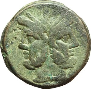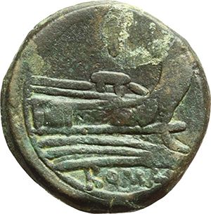 Roman Republican. As, after 211. Obv.: Laureate head of Janus; above mark of value I. Rev.: Prow right; above mark of value I. Below, ROMA. Syd. 143. Cr. 56/2. AE. g. 34.41 mm. 32.00 VF. Repubblica Romana. Asse, dopo il 211. Testa laureata di Giano; sopra segno di valore I. D/ Testa laureata di Giano; sopra segno di valore I. R/ Prua a destra; sopra segno di valore I. Sotto, ROMA. Syd. 143. Cr. 56/2. AE. g. 34.41 mm. 32.00 BB.