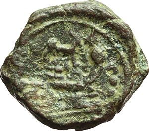 Roman Republican. 'Ass' series. Quadrans, ca 169-158. Obv.: Head of Hercules right, wearing lion skin, behind three pellets. Rev.: Prow right; above, butterfly ass, before three pellets. Below, ROMA. Syd. 298c. Cr. 195/4. AE. g. 7.66 mm. 19.80 NC. VF. Repubblica Romana. Serie 'asino'. Quadrante, ca 169-158. D/ Testa di Ercole a destra con pelle di leone, dietro tre globetti. R/ Prua a destra; sopra asino, davanti tre globetti. Sotto, ROMA. Syd. 298c. Cr. 195/4. AE. g. 7.66 mm. 19.80 NC. BB.