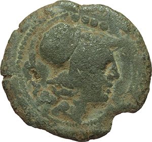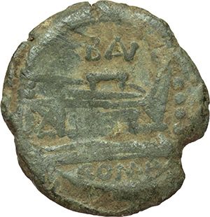 Roman Republican. BAL series. Triens, Central Italy ca 169-158. Obv.: Helmeted head of Minerva right, behind four pellets. Rev.: Prow right; above BAL, before four pellets. Below, ROMA. B. Naevia 3. Syd 354b. Cr. 179/3. AE. g. 7.36 mm. 24.30 NC. VF. Repubblica Romana. Serie BAL. Triente, Italia centrale ca 169-158. D/ Testa di Minerva elmata a destra, dietro quattro globetti. R/ Prua a destra; sopra BAL, davanti quattro globetti. Sotto, ROMA. B. Naevia 3. Syd 354b. Cr. 179/3. AE. g. 7.36 mm. 24.30 NC. BB.