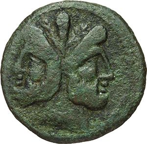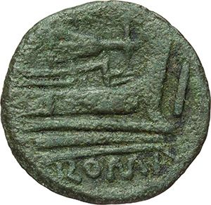 Roman Republican. 'Bird and rudder' series. As reduced, ca 206-195. Obv.: Laureate head of Janus, above mark of value I. Rev.: Prow right; above bird and rudder, before mark of value. Below, ROMA. Syd. 292. Cr. 117B/1. AE. g. 15.02 mm. 29.00 About VF. Repubblica Romana. Serie 'uccello e timone'. Asse ridotto,ca 206-195. D/ Testa di Giano laureata, sopra segno di valore I. R/ Prua a destra; sopra timone ed uccello, davanti segno di valore. Sotto, ROMA. Syd. 292. Cr. 117B/1. AE. g. 15.02 mm. 29.00 qBB.