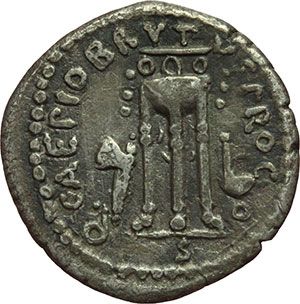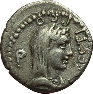 Roman Republican. Brutus. Denarius, 43-42 BC. Obv.: L. SESTI. PRO. Q. Veiled adn draped bust of Libertas right. Rev.: Q. CAEPIO BRVTVS PRO COS. Tripod between axe and simpulum. Cr.502/2. AG. g. 3.54 mm. 17.00 RR. VF. Very rare. Old cabinet tone. Repubblica Romana. Bruto. Denario, 43-42 a.C. D/ L. SESTI. PRO. Q. Busto velato e drappeggiato di Libertas a destra. R/ Q. CAEPIO BRVTVS PRO COS. Tripode tra ascia e simpulum. Cr.502/2. AG. g. 3.54 mm. 17.00 RR. BB. Molto raro. Patina di monetiere.