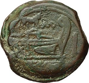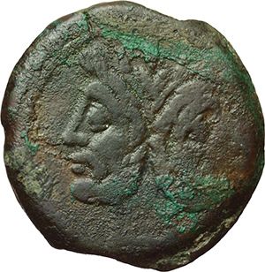 Roman Republican. 'Bull and MD' series. As, ca 189-180. Obv.: Laureate head of Janus, above mark of value I. Rev.: Prow right; above bull and MD; before mark of value and below, ROMA. Syd. 299. Cr. 142/1. AE. g. 31.04 mm. 32.50 Weakness on obverse. Good VF. Repubblica Romana. Serie 'toro e MD'. Asse, ca 189-180. D/ Testa di Giano laureata, sopra segno di valore I. R/ Prua a destra; sopra toro e MD, davanti segno di valore. Sotto, ROMA. Syd. 299. Cr. 142/1. AE. g. 31.04 mm. 32.50 Debolezze al D/. BB+.
