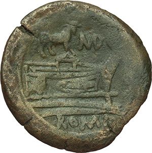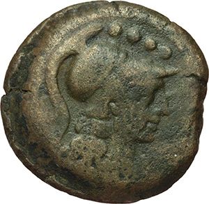 Roman Republican. 'Bull and MD' series. Triens, ca 189-180. Obv.: Helmeted head of Minerva right, above four pellets. Rev.: Prow right; above Bull-MD, before four pellets. Below, ROMA. Syd. 299b. Cr. 142/3. AE. g. 9.93 mm. 23.00 RR. Good VF. Repubblica Romana. Serie 'toro e MD'. Triente,ca 189-180. D/ Testa di Minerva elmata a destra, sopra quattro globetti. R/ Prua a destra; sopra Toro-MD, davanti quattro globetti. Sotto, ROMA. Syd. 299b. Cr. 142/3. AE. g. 9.93 mm. 23.00 RR. BB+.