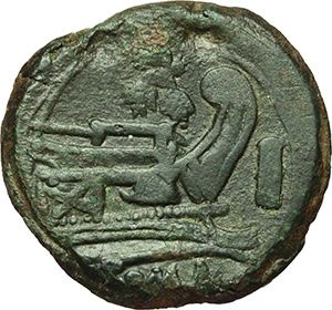 Roman Republican. 'Butterfly and vine branch' series. As, ca 169-158. Obv.: Laureate head of Janus, above mark of value I. Rev.: Prow right; above butterfly and vine branch, before mark of value. Below, ROMA. Syd. 296. Cr. 184/1a. AE. g. 26.04 mm. 32.50 Good VF. Repubblica Romana. Serie 'Farfalla e ramo di vite'. Asse,ca 169-158. D/ Testa Giano laureata, sopra segno di valore I. R/ Prua a destra; sopra farfalla su ramo di vite, davanti segno di valore. Sotto, ROMA. Syd. 296. Cr. 184/1a. AE. g. 26.04 mm. 32.50 BB+.