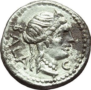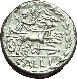 Roman Republican. C. Allius Bala. Denarius, 92 BC. Obv.: Female head (Diana?) right. BALA behind. C below chin. Rev.: Diana driving biga of stags right. Anchor below. In exergue: C. ALLI. Cr.336/1b. B.4. AG. g. 3.93 mm. 17.50 EF. Repubblica Romana. C. Allius Bala. Denario, 92 a.C. D/ Testa muliebre (Diana?) a destra. Dietro, BALA. Sotto il mento, C. R/ Diana in biga di cervi a destra. Sotto i cavalli, ancora. In esergo: C. ALLI. Cr.336/1b. B.4. AG. g. 3.93 mm. 17.50 Circoscritte superficiali ossidazioni al D/, assolutamente intatte, altrimenti SPL.
