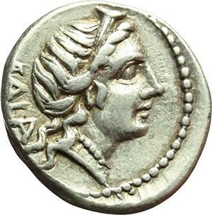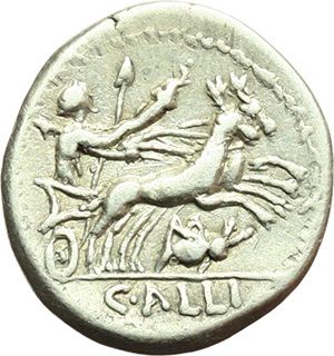 Roman Republican. C. Allius Bala. Denarius, ca 92. Obv.: Female head right, wearing diadem; behind BALA. Rev.: Diana in biga of stags right; with quiver over shoulder and holding sceptre and reins in left hand and torch in right; below horses, plough. In exergue, C·ALLI. B. Aelia 4. Syd. 595. Cr. 336/1. AG. g. 3.93 mm. 17.20 Good VF. Repubblica Romana. C. Allius Bala. Denario, ca 92. D/ Testa femminile diademata a destra; dietro BALA. R/ Diana in quadriga di cervi a destra; tiene scettro e redini nella mano sinistra ed una torcia nella destra; sotto cavalletta. In esergo, C.ALLI. B. Aelia 4. Syd. 595. Cr. 336/1. AG. g. 3.93 mm. 17.20 BB+.