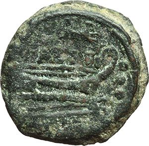 Roman Republican. C. Antesti. Quadrans, ca 146. Obv.: Head of Hercules right, wearing lion skin, behind three pellets. Rev.: Prow right; above, C.ANTESTI and dog, before three pellets. Below, ROMA. B. Antestia 6. Syd. 407c. Cr. 219/5. AE. g. 7.78 mm. 20.00 RR. VF. Repubblica Romana. C. Antesti. Quadrante, ca 146. D/ Testa di Ercole a destra con pelle di leone, dietro tre globetti. R/ Prua a destra; sopra C.ANTESTI e cane, davanti tre globetti. Sotto, ROMA. B. Antestia 6. Syd. 407c. Cr. 219/5. AE. g. 7.78 mm. 20.00 RR. BB.