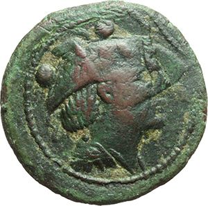 Roman Republican.    C. Aurunculeius. Sextans, Sardinia ca 209. Obv.: Head of Mercury right, above two pellets. Rev.: Prow right, above ROMA, before AVR. Below, two pellets. B. Aurelia 14. Syd. 162d. Cr. 65/6. AE. g. 3.71  mm. 20.00    VF. Traces of overstraiking.    Repubblica Romana.    C. Aurunculeius. Sestante, Sardegna ca 209.  D/ Testa di Mercurio a destra, sopra due globetti. R/ Prua a destra; sopra ROMA, davanti AVR. Sotto, due globetti. B. Aurelia 14. Syd. 162d. Cr. 65/6. AE. g. 3.71  mm. 20.00    BB. Tracce di riconiazione.
