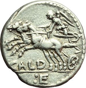 Roman Republican. C. Coelius Caldus. Denarius, ca 104. Obv.: Helmeted head of Roma left;. Rev.: Victory driving biga left; below CALD. In exergue, E. B. Coelia 3. Syd. 582a. Cr. 318/1b. AG. g. 3.92 mm. 18.00 Good VF. Repubblica Romana. C. Coelius Caldus. Denario, ca 104. D/ Testa elmata di Roma a sinistra. R/ Vittoria su quadriga a sinistra; sotto CALD. In esergo, E. B. Coelia 3. Syd. 582a. Cr. 318/1b. AG. g. 3.92 mm. 18.00 BB+.
