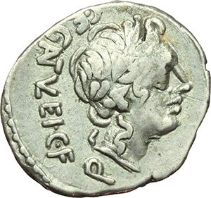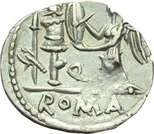 Roman Republican. C. Egnatuleius C.f. Quinarius, ca 97. Obv.: C·EGNATVLEI·C·F·Q Laureate head of Apollo right. Rev.: Victory standing left inscribing shield set on trophy; in left field, carnyx. Between Victory and trophy, Q. In exergue, ROMA. B. Egnatuleia 1. Syd. 588. Cr. 333/1. AG. g. 1.90 mm. 16.00 Areas of weakness. VF. Repubblica Romana. C. Egnatuleius C.f. Quinario, ca 97. D/ C·EGNATVLEI·C·F·Q Testa laureata di Apollo a destra. R/ Vittoria a sinistra; inscrive uno scudo posto su un trofeo, nel campo a sinistra, carnyx. Nel campo al centro, Q. In esergo, ROMA. B. Egnatuleia 1. Syd. 588. Cr. 333/1. AG. g. 1.90 mm. 16.00 Debolezze da conio. BB.