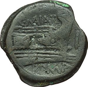 Roman Republican. C. Maianius. As, ca 153. Obv.: Laureate head of Janus; above mark of value I. Rev.: Prow right, above C.MAIANI, before mark of value. Below, ROMA. B. Maiania 2. Syd. 428. Cr. 203/2. AE. g. 17.99 mm. 31.20 VF. Repubblica Romana. C. Maianius. Asse, ca 153. D/ Testa di Giano laureata, sopra segno di valore I. R/ Prua a destra; sopra C.MAIANI, davanti segno di valore I. Sotto, ROMA. B. Maiania 2. Syd. 428. Cr. 203/2. AE. g. 17.99 mm. 31.20 BB.